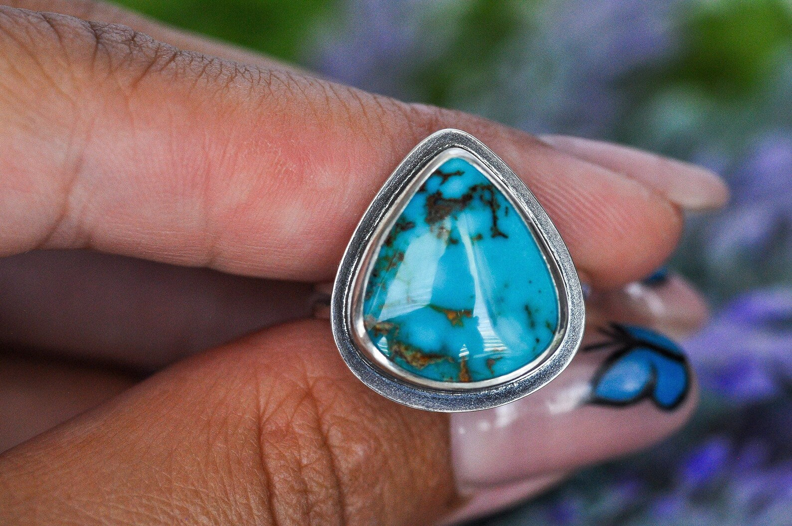 Your Turquoise ring will be set in sterling silver, in either a half round or rectangle band. See last photos for examples of finished piece. If you'd like to further customize your ring, please contact me.
