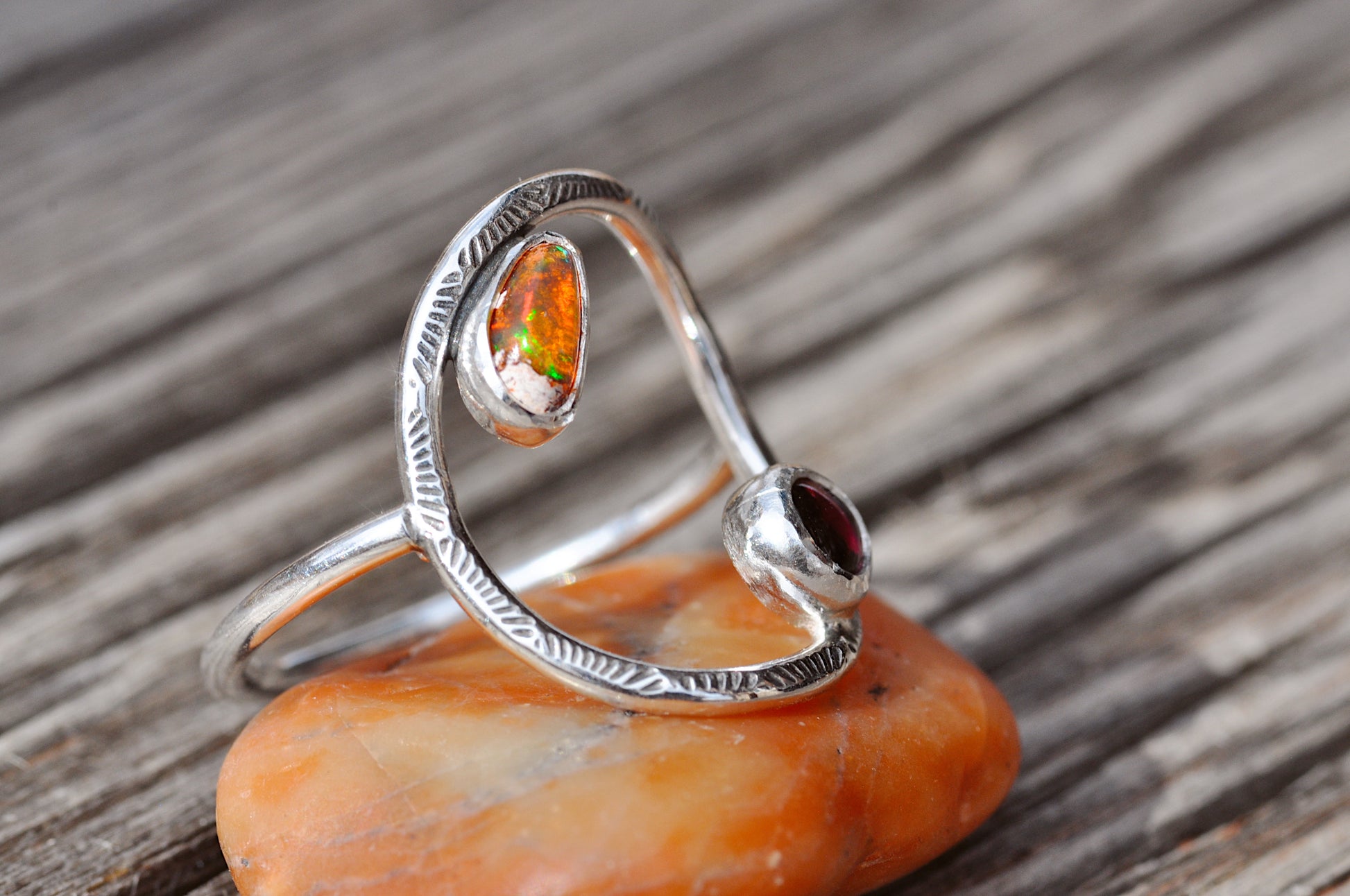 Sterling silver handcrafted open concept ring with Mexican Opal and Garnet and sun stamped accents